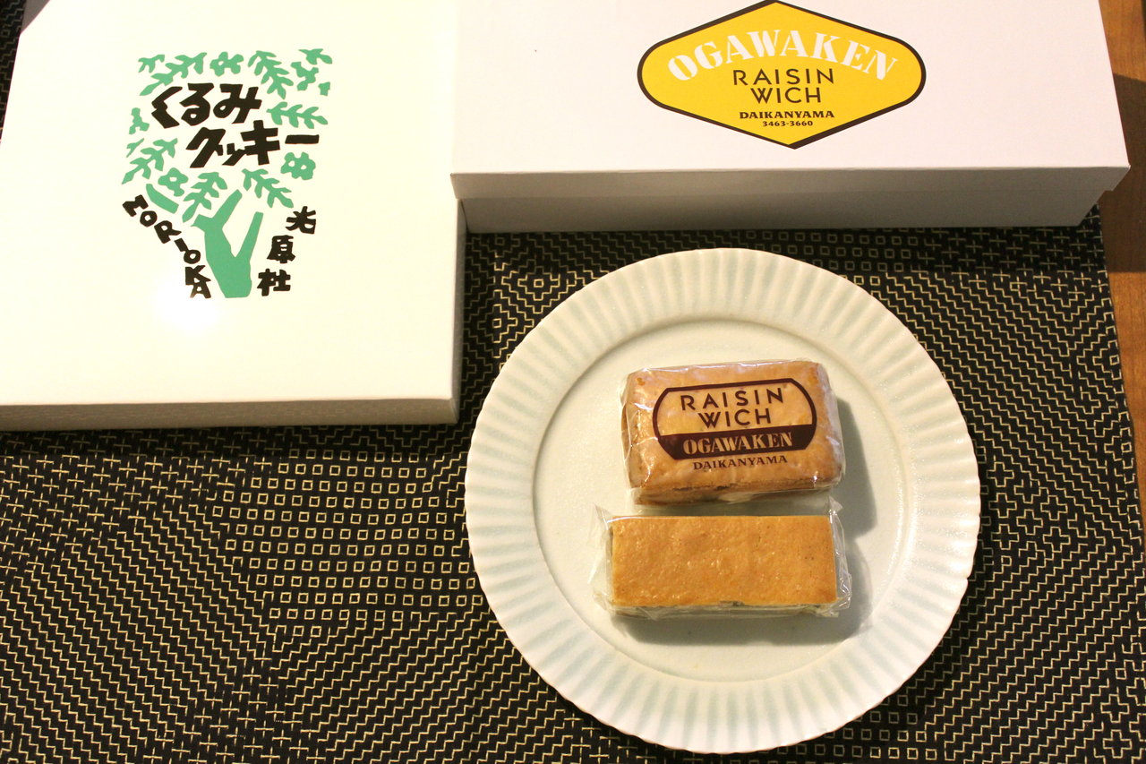 盛岡の光原社のくるみクッキーと、代官山の小川軒のレーズンウィッチ。