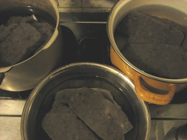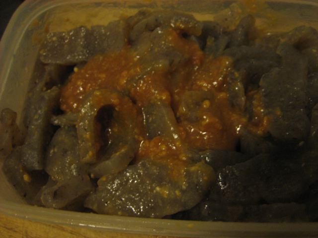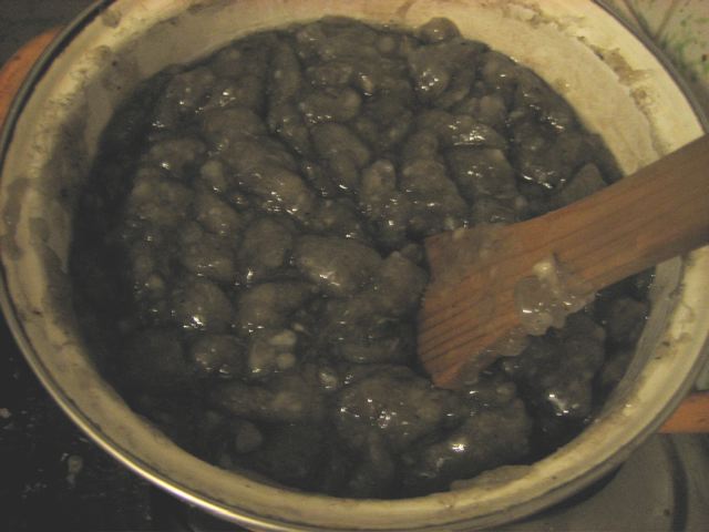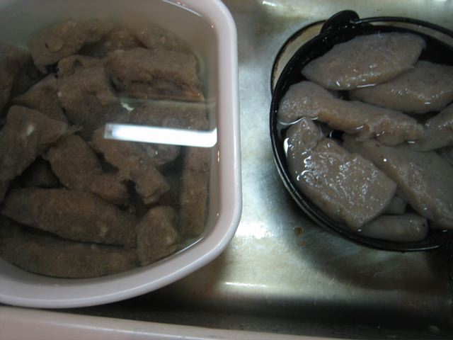長くなりましたが、芋すって、水入れて、火にかけて、アルカリ入れて、固めて茹でるだけ!(だけ?)