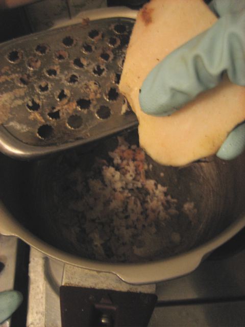皮を剥いてすりおろします。今回は皮をほとんど剥かなかったのでグレーのこんにゃくになります。