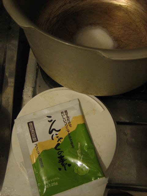 ぬるま湯に溶かしたこんにゃくの素(炭酸ナトリウム)を加え手早く混ぜる。