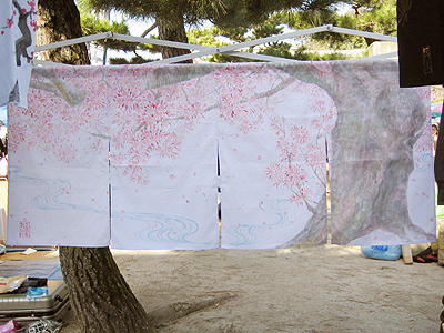 半年以上前にいただいてた暖簾の注文の絵がやっと完成して、昨日の手作り市でお披露目。みんな気づいてくれるかとドキドキしてたんやけど、いろんな人に褒めてもらえてとっても幸せ。依頼主の方にも電話以外でははじめてお会いして、とってもステキな方でうれしい。個人の方からの依頼はなかなかタイミングが合わずお断りする事が多いのですが、この暖簾の話はたまたまお受けしてたのですが、ご本人にお会いして納得!我ながらいい感もってます♪