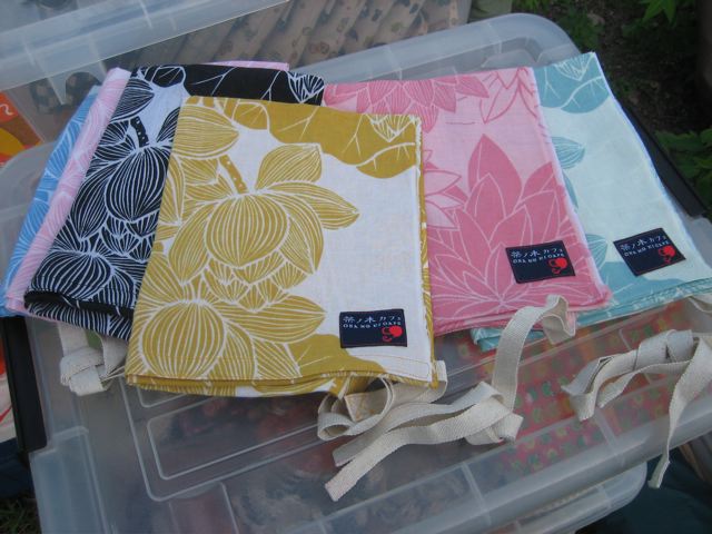 茶ノ木カフェのふみえさんさんが手ぬぐいをサロンにしたと持ってきてくれました。かわいい!作りもシンプルでいい感じです。近々茶ノ木カフェで販売されるかも?!