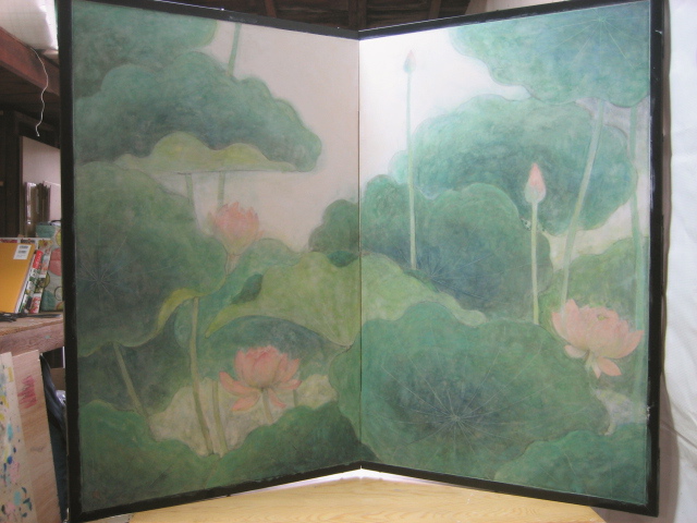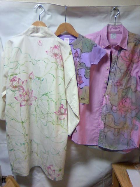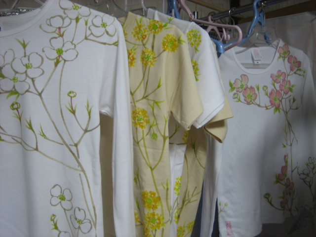蓮の日本画とともに春花や新柄のワンピースやTシャツも並びます。