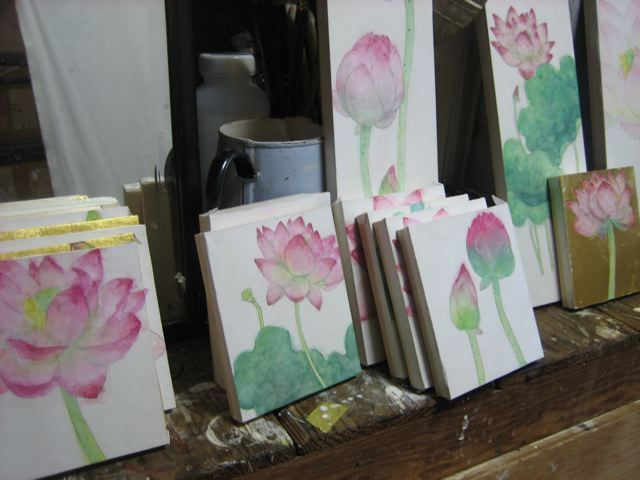 手のひらサイズの日本画も制作。やっぱりいいな日本画。和紙にのっかる顔料の具合がなんともいい。好きだ。金箔はったりなんかしてみたり。