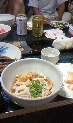 夕食にビールと手打ちうどん(待ってました!)をいただいて、後ろ髪ひかれつつ、お先に失礼してきました。