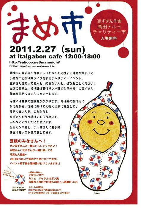 闘病中の豆ずきん作家高田テルヨチャンを応援する仲間たちが集まって一日だけの市をします。