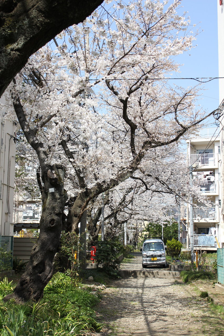 京都の風情があるお寺や鴨川でみる桜もそりゃいいけど、こんな風に団地や公園やら街路樹やら生活の中に桜がたくさんある東京ってのもとっても素敵。